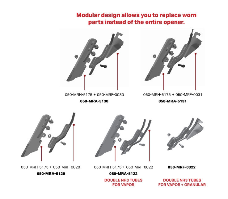 Overview: This 1/2” wide low disturbance MRS fertilizer knife is a low maintenance alternative to Mid Row Banders. It has double carbide on the nose as well as hard facing above the carbide and on the sides for longer wear. 050-MRA-5130 applies both NH3 + Granular.